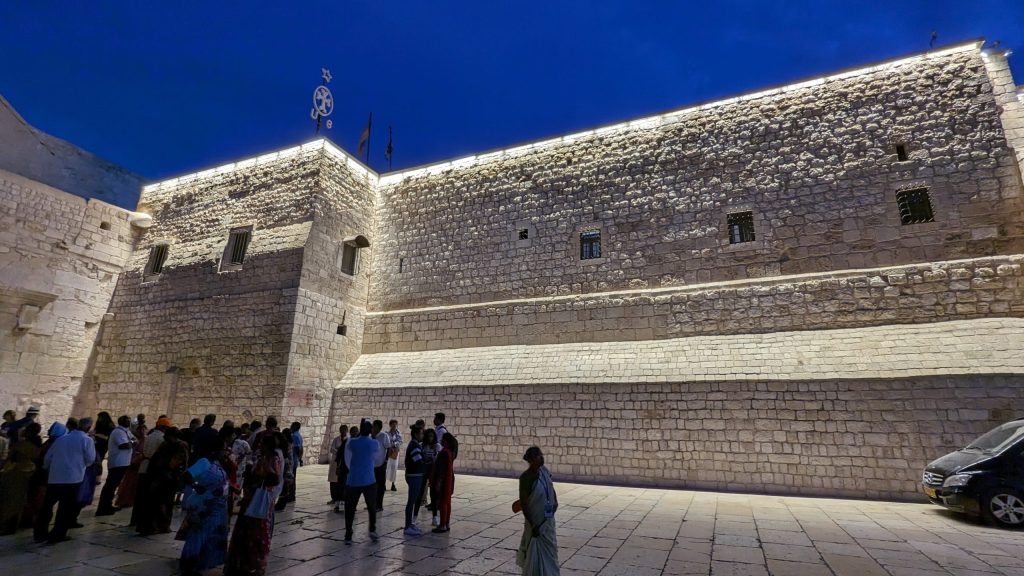 Der Sonntag, der 1.Oktober 2023, war von vornherein der herausforderndste Tag der Konzert- und Pilgerreise, standen doch ein Gottesdienst in der Erlöserkirche Jerusalem und ein Konzert in der Katharinenkirche Bethlehem auf dem Programm. Kurz vor der Reise erfuhren wir, dass Frau Annette Kurschus, die Ratsvorsitzende der EKD, die Predigt im Gottesdienst halten würde und einige Synodenmitglieder der EKD zu Gast im Gottesdienst sein würden. Der Bachchor sang die schwere, aber festliche Motette „Die Himmel erzählen die Ehre Gottes“ von H. Schütz, das jubelnde „Jauchzet dem Herrn, alle Welt“ von Felix Mendelssohn-Bartholdy und das anrührende „Ich hebe meine Augen auf“ des Romantikers Albert Becker. Die Gemeinde von Jerusalem mit ihren prominenten Gästen aus Deutschland bedankte sich mit einem langanhaltenden Applaus beim Bachchor Gütersloh. Am Jaffa-Tor wurden wir von unserem Busfahrer aufgegriffen und die Fahrt ging nach Bethlehem: nach einem kleinen Imbiss (Falafel) im Christmas Restaurant (!) ging es weiter zum Krippenplatz, zur Geburtskirche und zu unserem Konzertort, der zur Geburtskirche benachbarten Katharinenkirche. Viele Chormitglieder nutzten die freie Stunde zum Besuch des Geburtsstelle Jesu. Im Kreuzgang der Katharinenkirche hielt Pfarrer Stefan Salzmann eine bewegende Andacht zur Geburt Jesu. Die anschließende Probe und das Konzert standen unter einem besonderen Stern, dem gemeinsamen Singen mit dem ansässigen christlich – palästinensischen Chor der Katharinenkirche. Die Begegnung mit den bethlehemitischen Sängerinnen und Sängern war geprägt von Offenheit und Neugierde auf beiden Seiten und von alsbald zunehmender Sympathie und Freundschaft. Beide Chöre bejubelten den Vortrag des anderen Chores begeistert und frenetisch, das gemeinsame Singen einer italienischen Motette wurde zu einem beeindruckenden Zeugnis vom gelungenen Brückenschlag zwischen zwei (Gesangs-) Kulturen und Welten. Ein festlicher Abend in einem Restaurant mit beiden Chören führte zu spontanem, fröhlichem gemeinsamen Singen und anhaltenden Freundschaftsbekundungen. Beseelt von einem ganz besonderen Tag fuhr die Gruppe in ihr Quartier.
